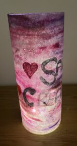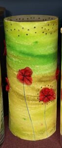 Aged 8 upwards – create a beautiful unique lamp using paints, stencils, block prints, fabrics (sewing machine – subject to age). Glass jar and led lights provided